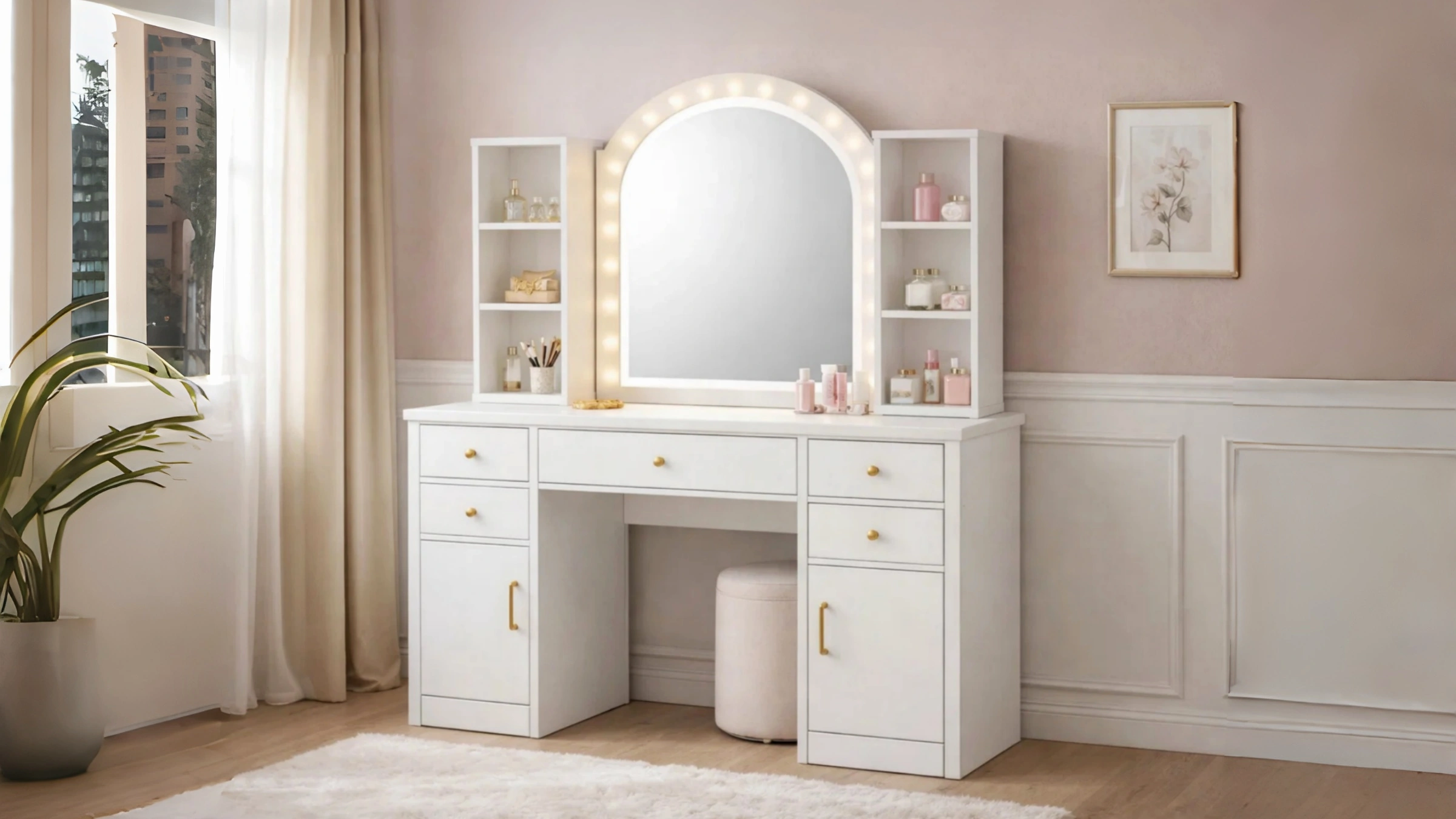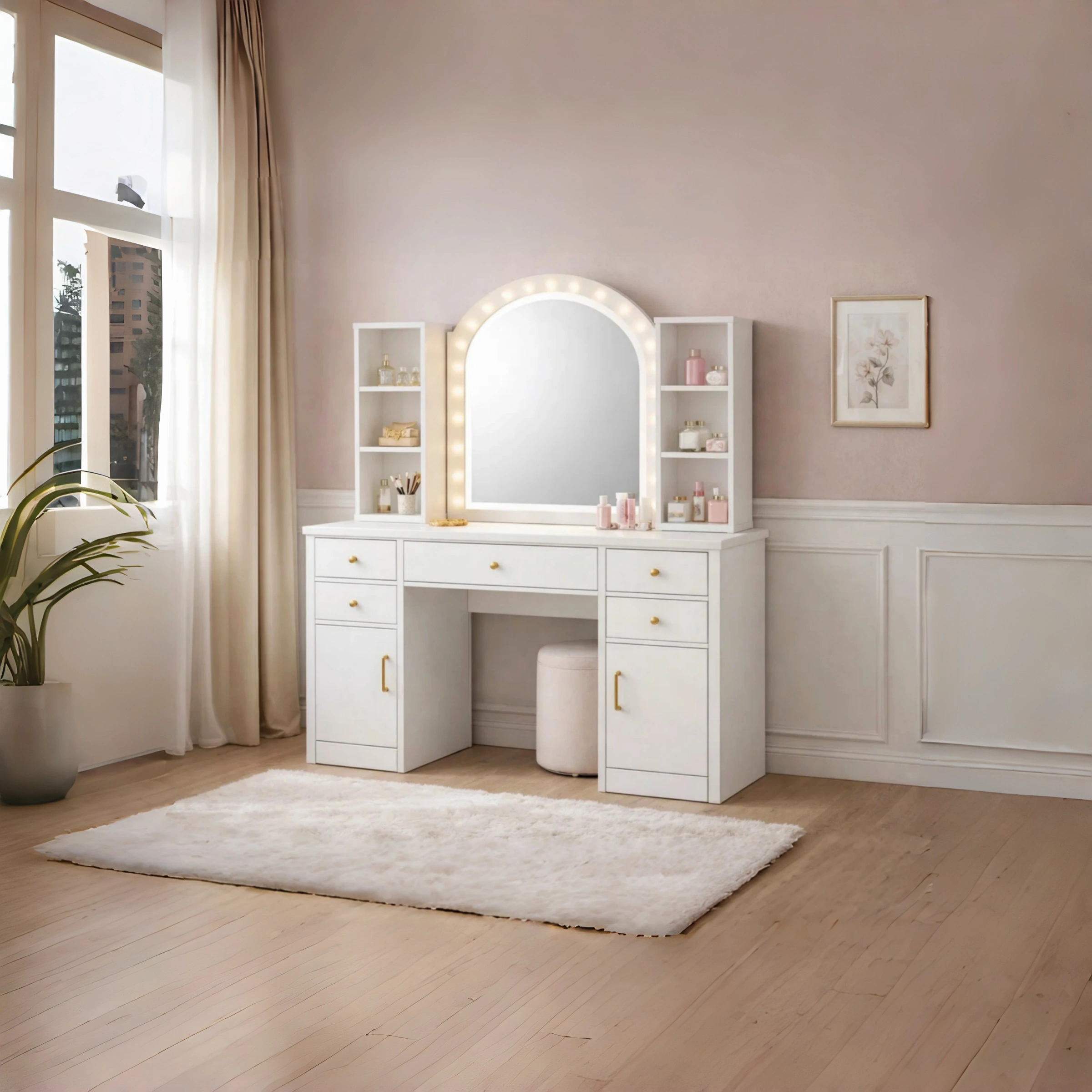 Estructura de MDF con espejo de vidrio templado y luz LED blanca integrada.